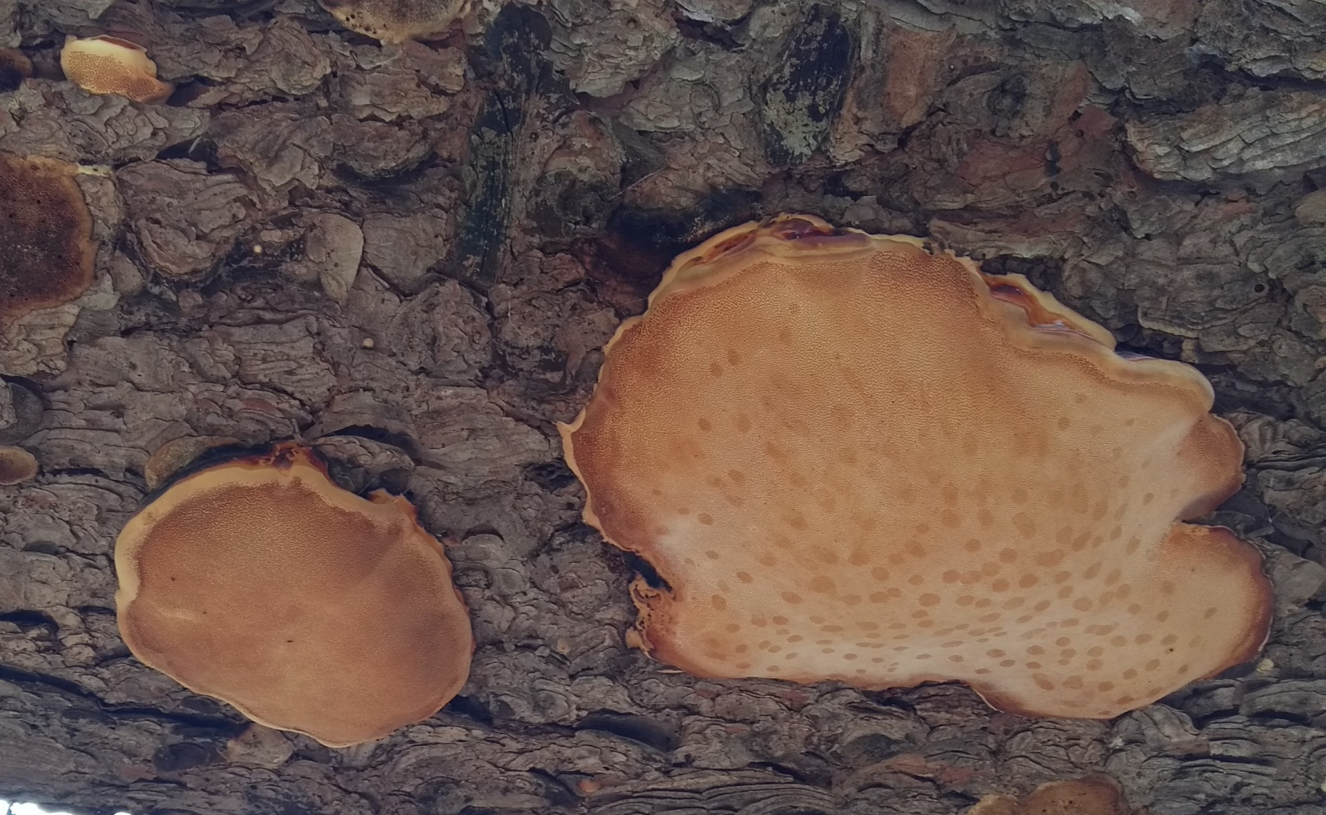zur seltsamen Wuchsform bei umgestürzten Bäumen habe ich heute an einer Fichte diese Fruchtkörper gefunden. Die Ansicht ist von unten auf die Poren. Der Baum liegt wohl schon länger.