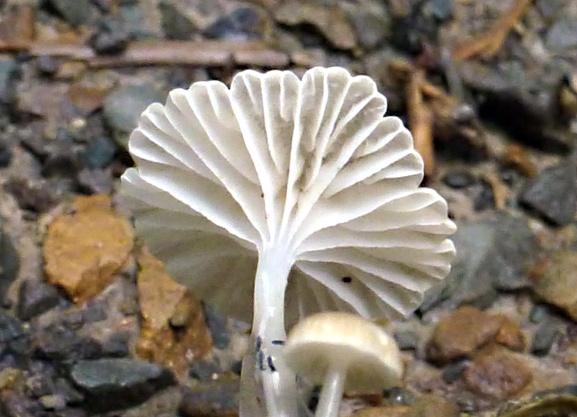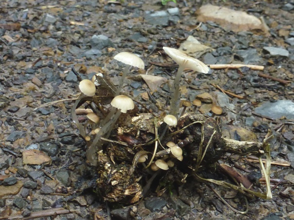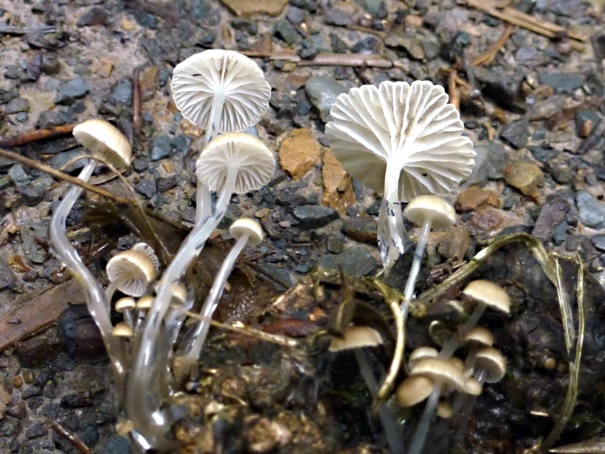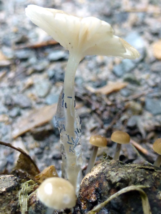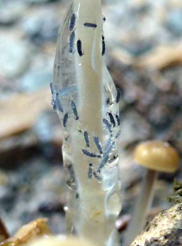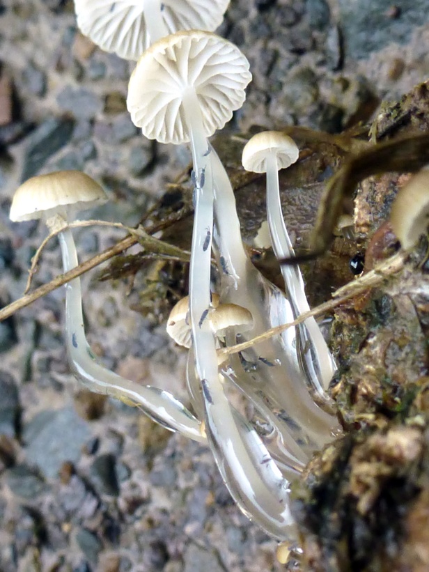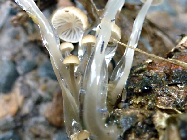 Bei der heutigen Gassirunde mit meinen Fußhupen fiel mir dieses Büschel kleiner Helmlinge auf. Bei näherer Betrachtung kann man sehr schön sehen, welchen Sinn der schleimige Stiel hat. Eine unüberwindbare Hürde für kleine Freßfeinde.