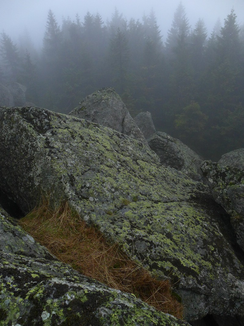 am 04.05.2013 war ich gemeinsam mit Alfred und Eduard auf einer Moos- und Flechtenexkursion im Fichtelgebirge unterwegs. Es ging mit der Bahn auf den Ochsenkopf hinauf. Leider erwartete uns oben noch schlechteres Wetter als schon unten im Tal. Nur 5 Grad und Nebel...Nebel und Regen...Gaaaanz ungünstig.