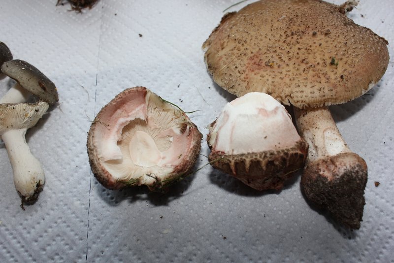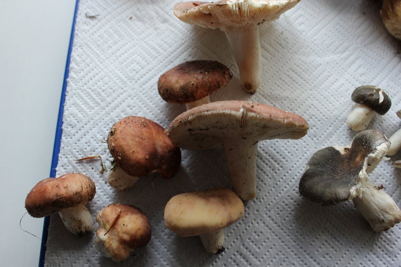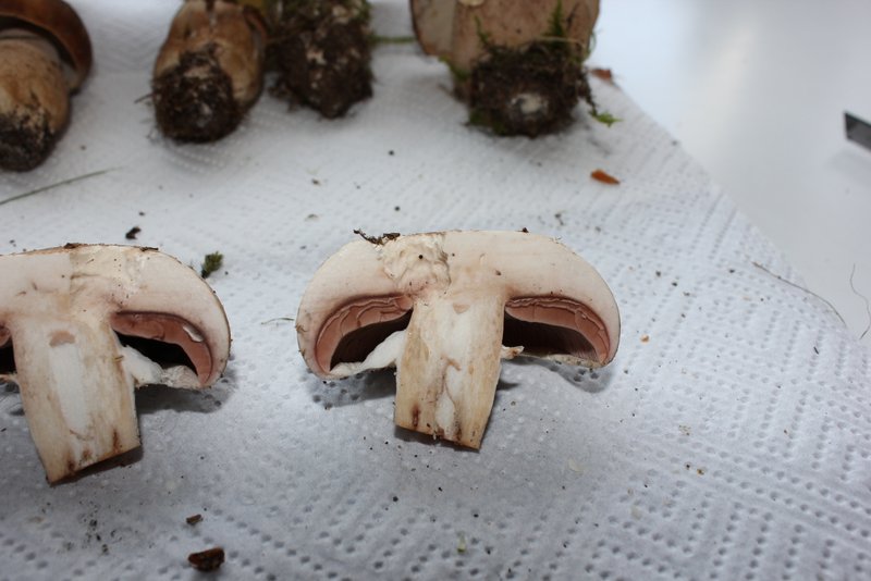 Der Champignon riecht nicht nur wie ein "Zuchtchampignon" (Agaricus bisporus), er sieht m. E. auch so aus und ist es wahrscheinlich auch. Die beiden Täublinge: der rothütige ziemlich sicher der Fleischrote Speisetäubling (Russula vesca), der dunkelblaue aufgrund der deutlich sichtbaren gelbbraunen Flecken in der Hutmitte wahrscheinlich der Blaue Reiftäubling (Russula parazurea).