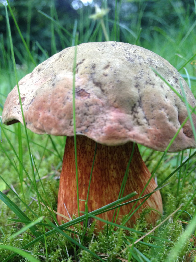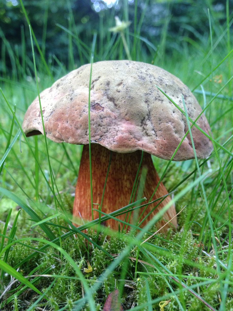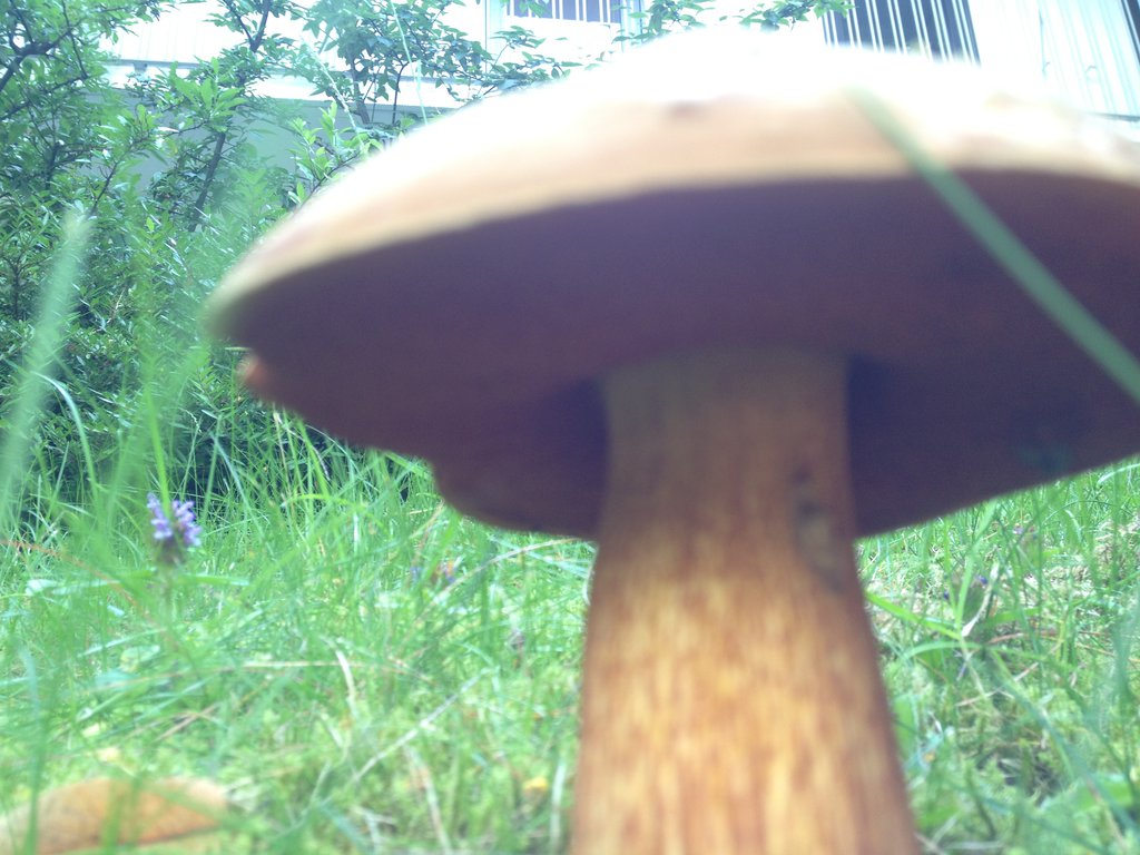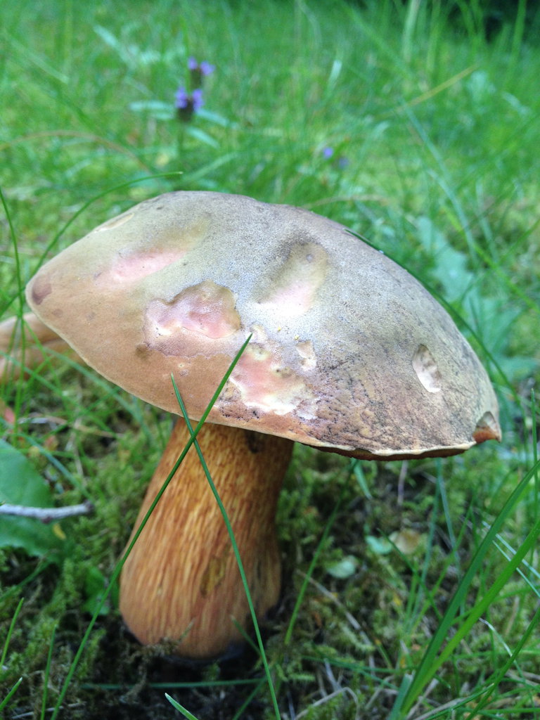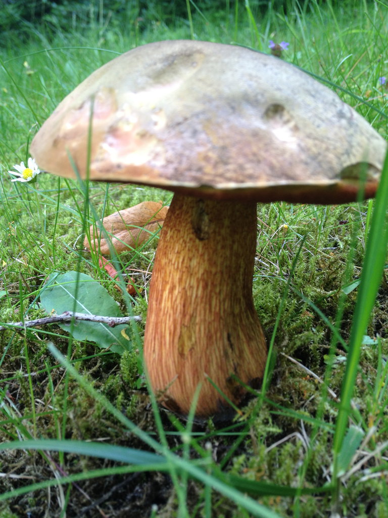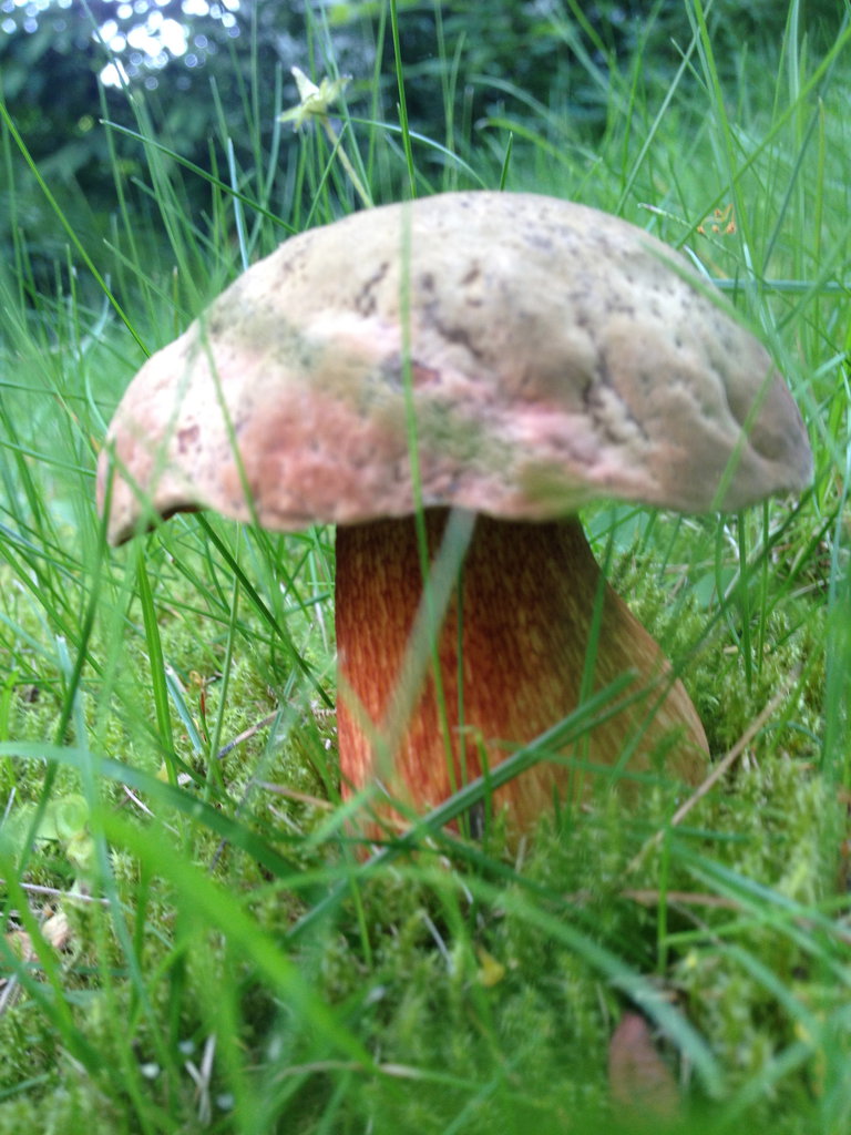 Ich selber würde an den Netzstieligen Hexen-Röhrling (Boletus luridus) denken. Farbe des Huts in real und der Stiel passen dazu. Die Röhren (unscharf im Foto) waren auch rötlich. Zwei Fruchtkörper sind abgebildet. Am Gartenrand haben verschiedene Laub- und Nadelbäume gewohnt.