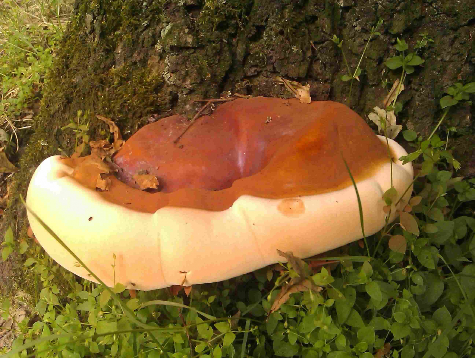 Ich empfehle Huhu, der gewählten Bezeichnung wenigstens ein "cf." hinzuzufügen, dann wird sie m. E. einem Bestimmungsversuch in Richtung eines Vertreters der Gattung Ganoderma mit harziger Oberfläche durchaus gerecht.