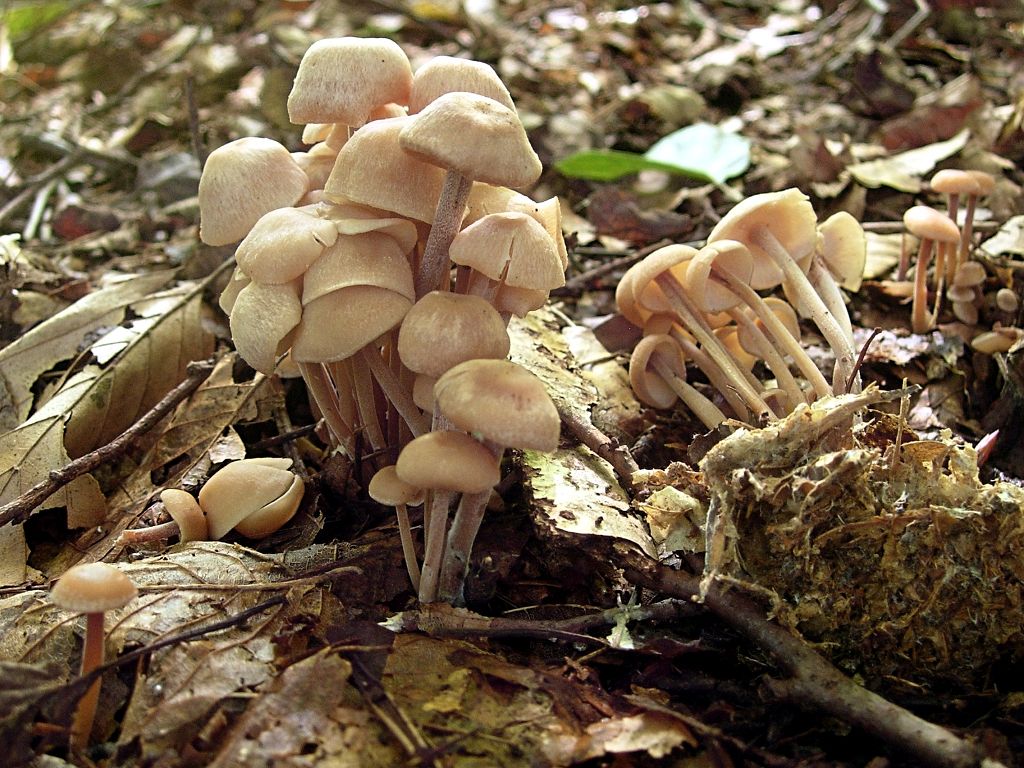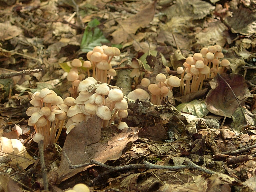 heute fand ich im Garten, hinterste Ecke, hinter unseren Laub- Nadelstreu- Grasschnittaufhäufungen, etliche Fruchtkörper des Knopfstieligen Blasssporrüblings (Gymnopus confluens).