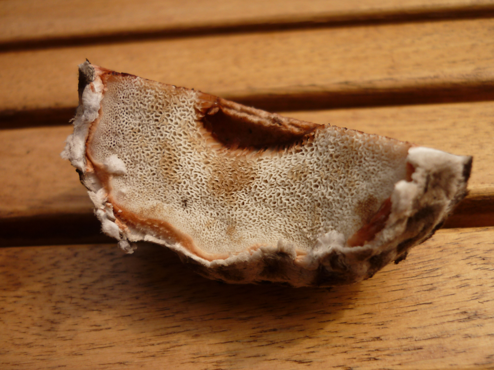 Röhren: blass hellgrau bis dunkelgrau, recht lang; Poren gleichfarben, im Alter auch dunkler bis fast schwarz; unregelmäßig und weit; auf Druck bräunend bis schwärzend; jung von flockigem Velum bedeckt, daß sich vom Hutrand aus lange über Tiele der Porenschicht legt