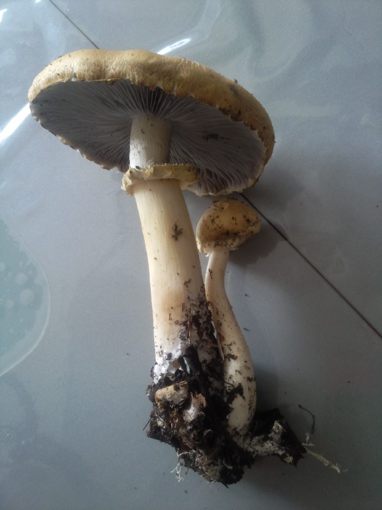 Diese Pilze habe ich heute gefunden, auch noch mehr davon. Sie standen auf einem Haufen alten Laubes und Rindenstückchen. Ich dachte erst es sei eine Art Waldchampignon, aber laut Pilzbuch würde ich eher auf den Braunen Riesenträuschling tippen. Die Pilze sind ca. 20 cm hoch und haben einen Hutdurchmesser von ca. 10 cm. Die Lamellen sind kräftig grau mit Tendenz zu violett. Geruch und Geschmack sind angenehm mild. Wer kann es ganz genau sagen was es ist?