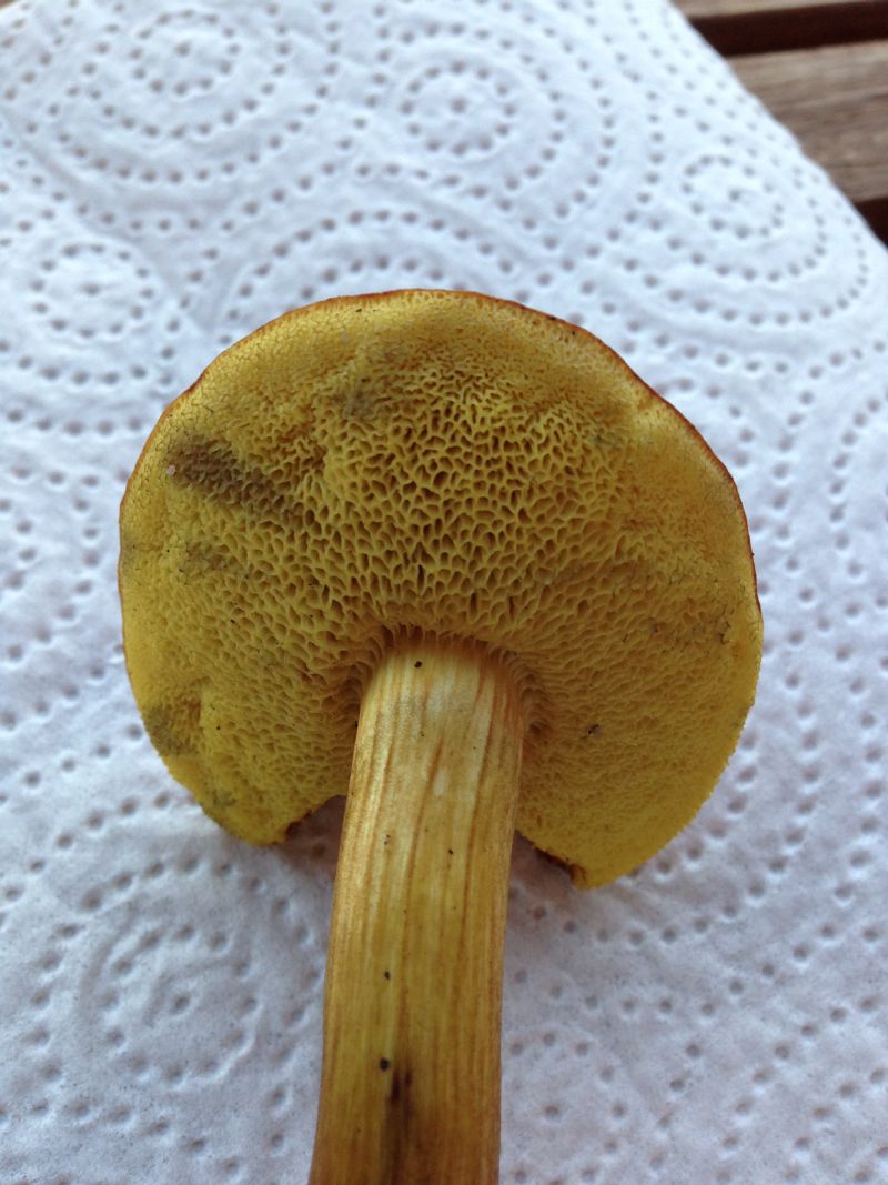 Der Pilz ist leicht blauend bei Berührung der Poren bzw. beim Zerschneiden auch am Stil. Geruch ist leicht obstartig und di Hutoberfläche fühlt sich samtig an.