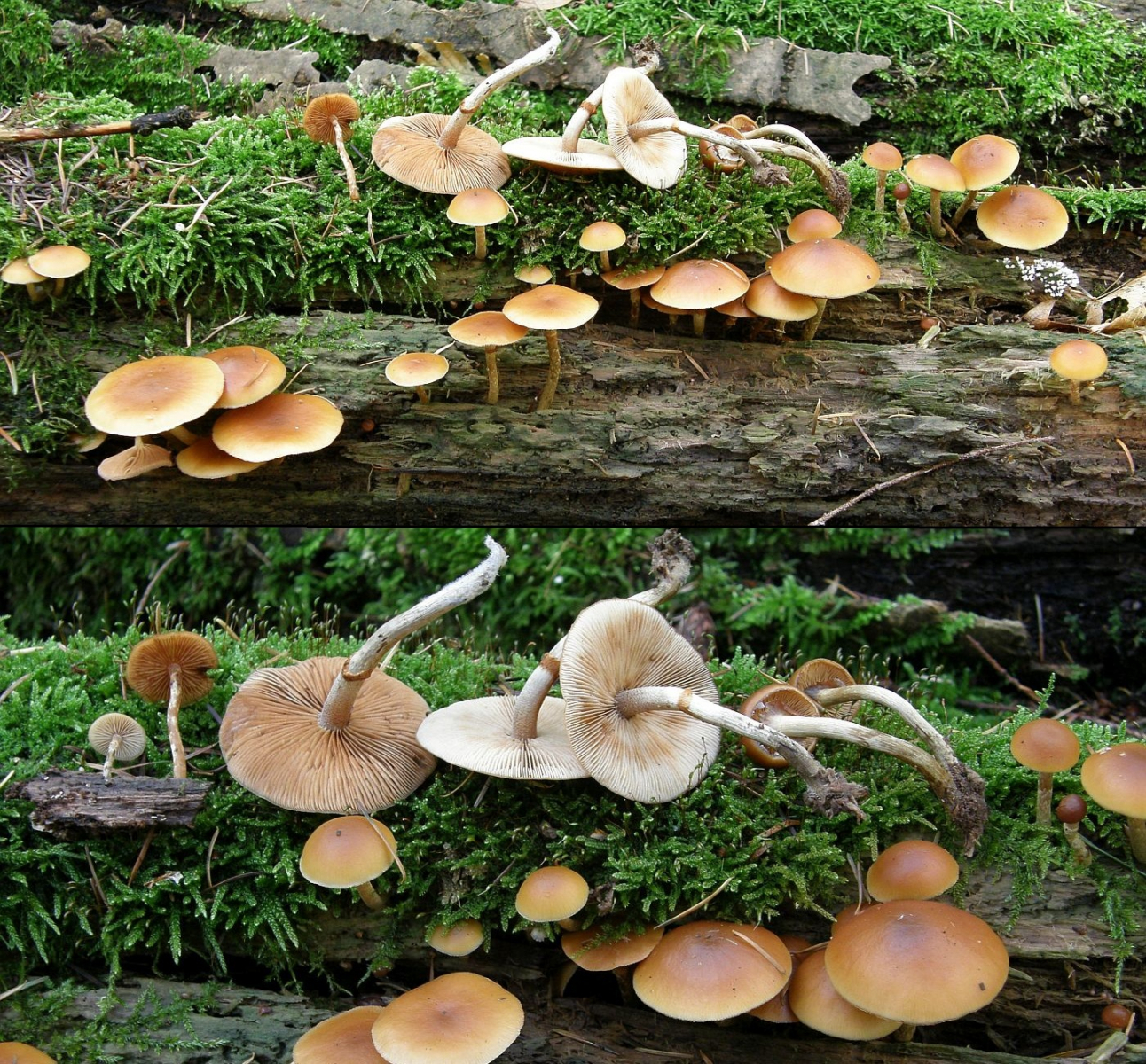 • Die Stockschwämmchen sind weder durch- noch beleuchtet. Die Galerina ist auch auf der vorderen Hälfte extrem hell von der Sonne angeleuchtet, das Stockschwämmchen daneben gar nicht am Rand.