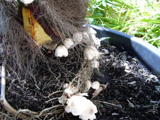 Die Palme habe ich vor ca. 10 Jahren vom Gardasee als kleiner Trieb mitgebracht. Auf einem Campingplatz wuchsen ähnliche Pilze auf und
