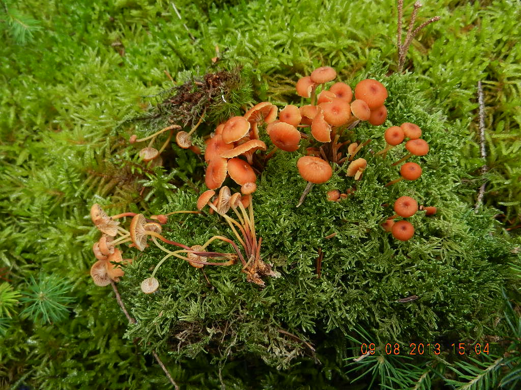 Bild 7: mir unbekannt; Nabelings- bzw. Schwindlingshabitus, der Hutdurchmesser ca. 1 cm, der rosshaarartige Stiel scharf abgegrenzt zweifarbig (oben blass orangebraun, unten kräftig rotbraun), büschelig wachsend auf bemoosten Nadelholzstümpfen, Geruch beim Aufnehmen schwach nach Blattwanzen ("Quietus-Geruch")