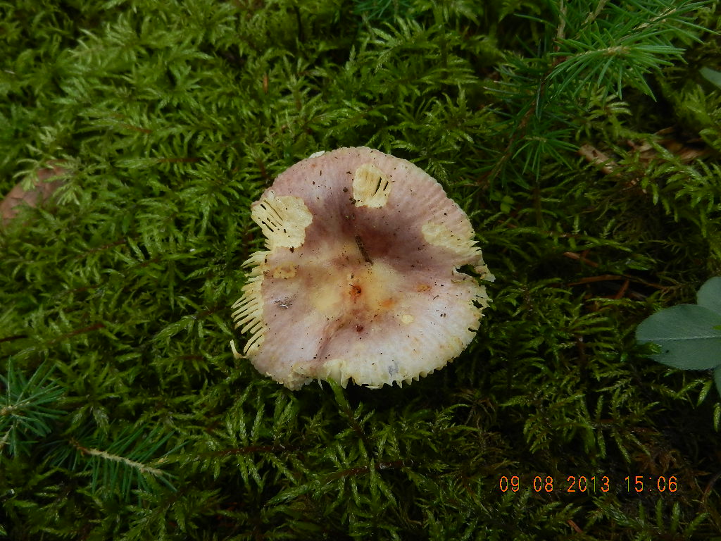 Russula puellaris (Milder Wachstäubling), stark gilbendes Fleisch, nur wenig septierte, keulige Dermatozystiden