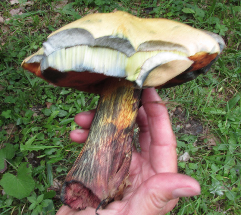 Wenn das alles verwirrend klingt, schneide mal den Hut durch. Zwischen dem Hutfleisch wird sich der Röhrenboden abbilden, dann folgen die Röhren. Da ich auch Boletus luridus, den Netzstieligen Hexenröhrling vermute, sollte sich im Schnittbild eine feine rote Linie abzeichnen, und zwar zwischen Hutfleisch und Röhren. Falls das zu undeutlich ist, trenne alle Röhren vom Hutfleisch, und zwar handisch, dann sollte der unverletzte Rörenboden für Klarheit sorgen.