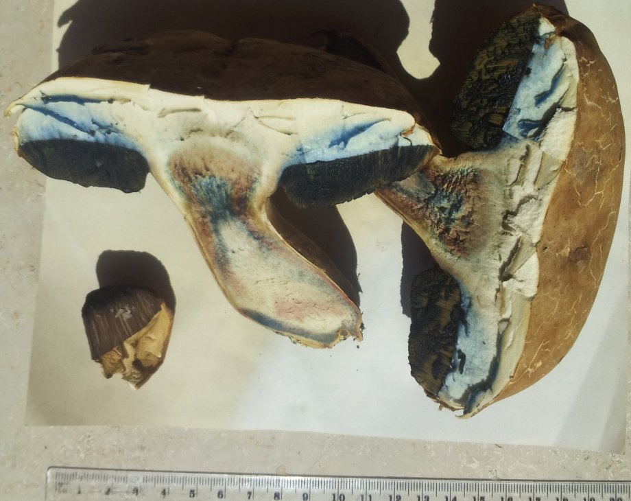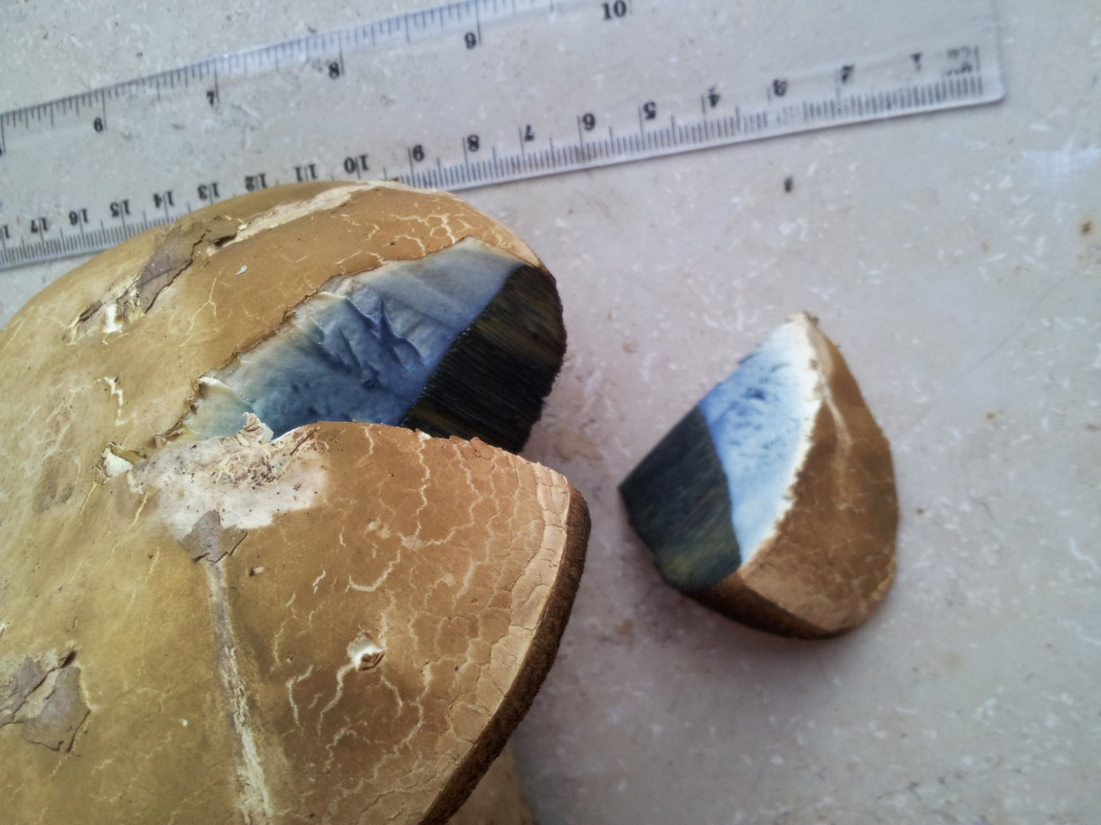 Beim Anschnitt wird das zunächst gelbliche Hutfleisch gleich blau, dann aber später weiß.