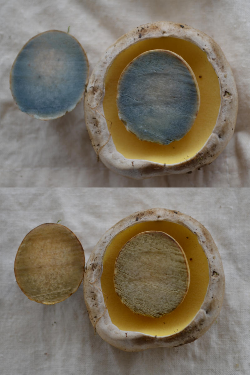 Im Anschnitt wird er sofort blau. Die Verfärbung verschwindet nach ca. 20min, siehe Fotos.