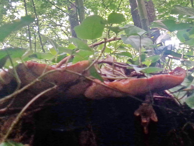 Den habe ich jetzt gesehen, vor zwei Tagen. Bild ist nicht das Originalbild - so sah der Pilz aber an einem alten Baumstamm aus. Zum Stiel + Lamellen leider nicht. Der Hut war aber nach Innen gewölbt.