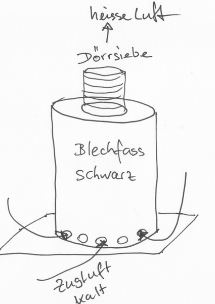 Das Prinzip ist einfach: Du brauchst einen flachen Kasten, der auf der Rückseite eine schwarz angemalte Pappe hat ( Bio Farbe) Low- cost-Variante hat als Abdeckung einen Bauplastik, sonst Plexiglas. Unten hat der Kasten Öffnungen, damit Luft angesogen werden kann. (Wenn du den Kasten auf feuchten Boden stellst, musst du was unterlegen, da sonst die Luft schon feucht einströmt. Jetzt musst du oben eine Kiste montieren, in denen Siebe sind. Die Luft wird locker 50 - 60 Grad warm... Du findest bestimmt Baupläne im Netz. Google mal nach Solartrockner. Gruss, André -