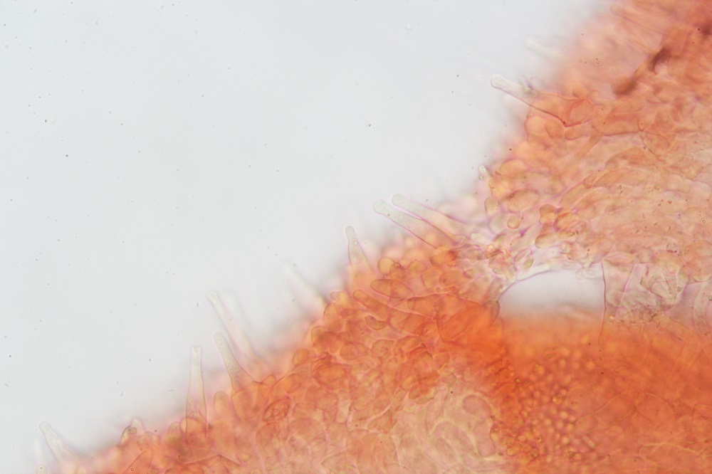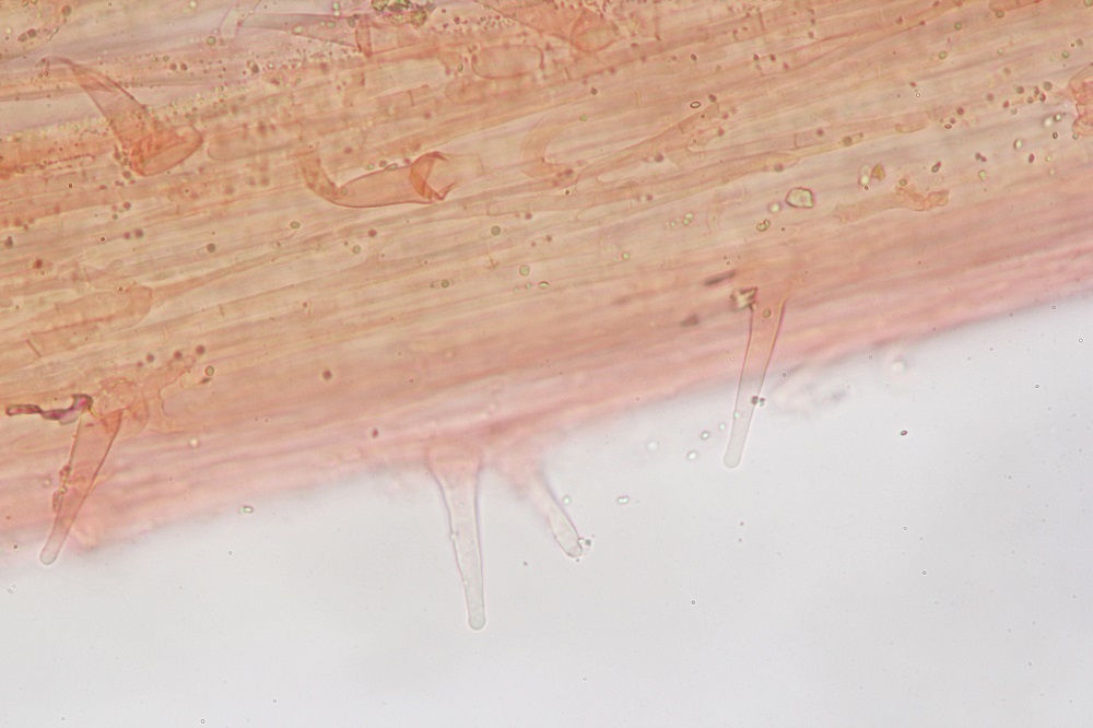 Stiel: dünn und zähe kann bis zu 4 cm lang sein, die orange Färbung wird deutlich blasser an der Basis die mit feine weisse Mycelreste endet, auch der stiel ist mit feinen weisslichen Härchen besetzt.