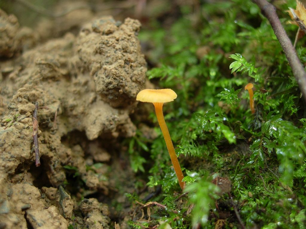 Hut: Klein nicht mehr als 1 cm, halbkugelig mit orange/rote leicht hygrophane Färbung, die mitte ist dunkler und genabelt, der rand ist wellig und kann schon mal gerieft erscheinen, im alter kann der Hut schon mal abgeflacht sein und der Rand kann sich auch nach oben biegen.