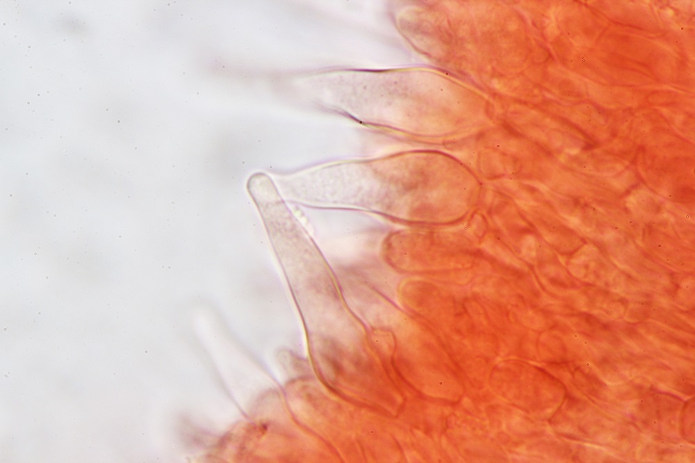 Stiel: dünn und zähe kann bis zu 4 cm lang sein, die orange Färbung wird deutlich blasser an der Basis die mit feine weisse Mycelreste endet, auch der stiel ist mit feinen weisslichen Härchen besetzt.