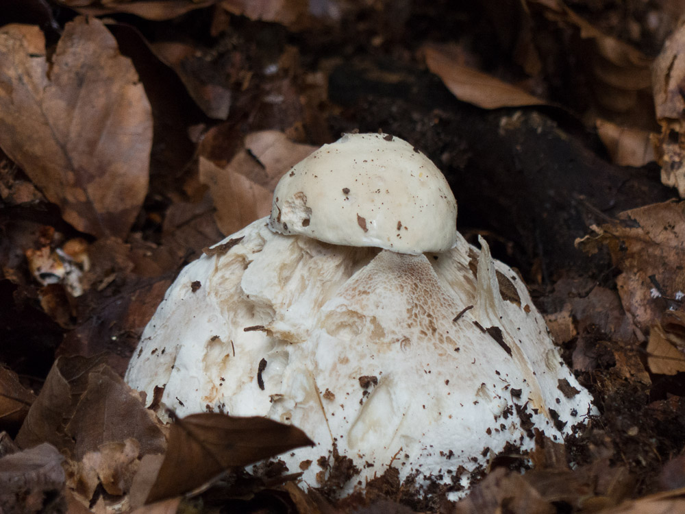 Auch ohne die Fruchtschicht zu sehen, führt der Habitus hier klar zu den Dickröhrlingen (Boletus). Ein weißes Stielnetz ist zu erkennen, das Fleisch ist weiß, schält sich am Stiel trockenheitsbedingt ab. Der Hut ist glatt und für jede Art außer B. edulis zu hell.
