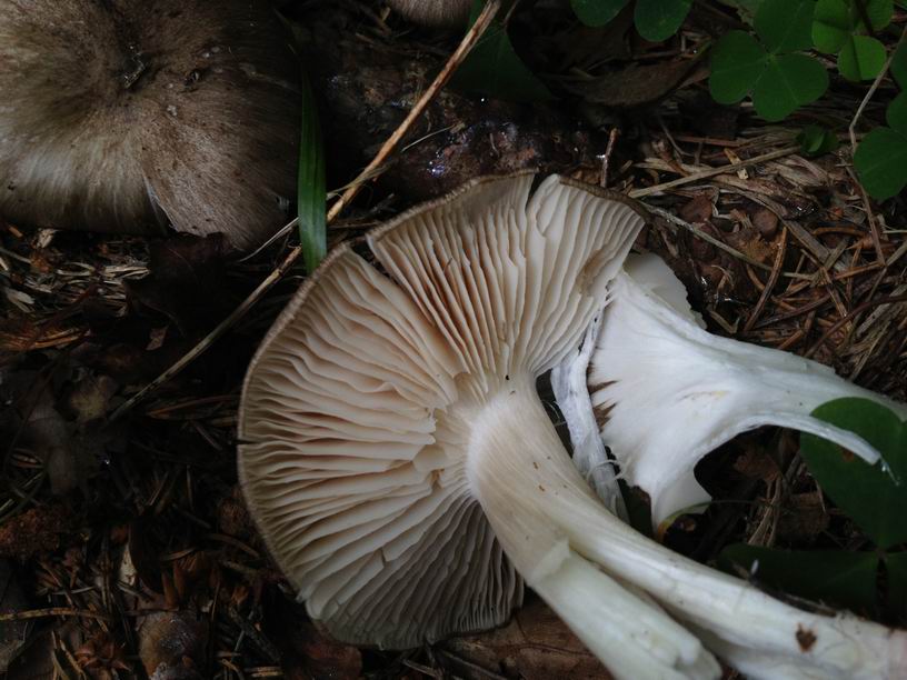 Nun habe ich aber eventuell ein Problem mit dem vermeintlichen Breitblatt. Haben die Lamellen da tatsächlich einen Rosa Schimmer, oder täusche ich mich da? Insgesamt halte ich es schon für sehr unwahrscheinlich (da passt vieles Andere gar nicht), aber wenn da rosa Sporenpulver rausfällt, der Pilz nicht auf Holz wächst (Hexenring ist bei M. platyphylla eher ungewöhnlich), dann sollte man mal bei den Rötlingen (Entoloma) suchen. Ist aber nur so eine ganz vage Alternatividee, ich kann's mir eigentlich nicht wirklich vorstellen.