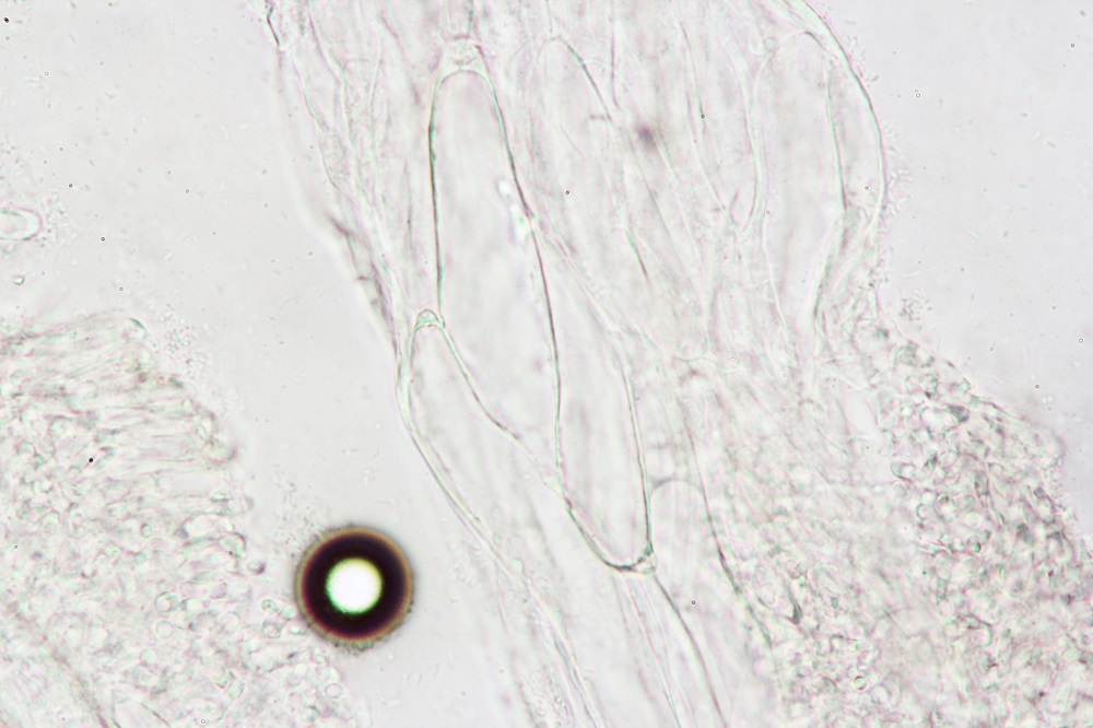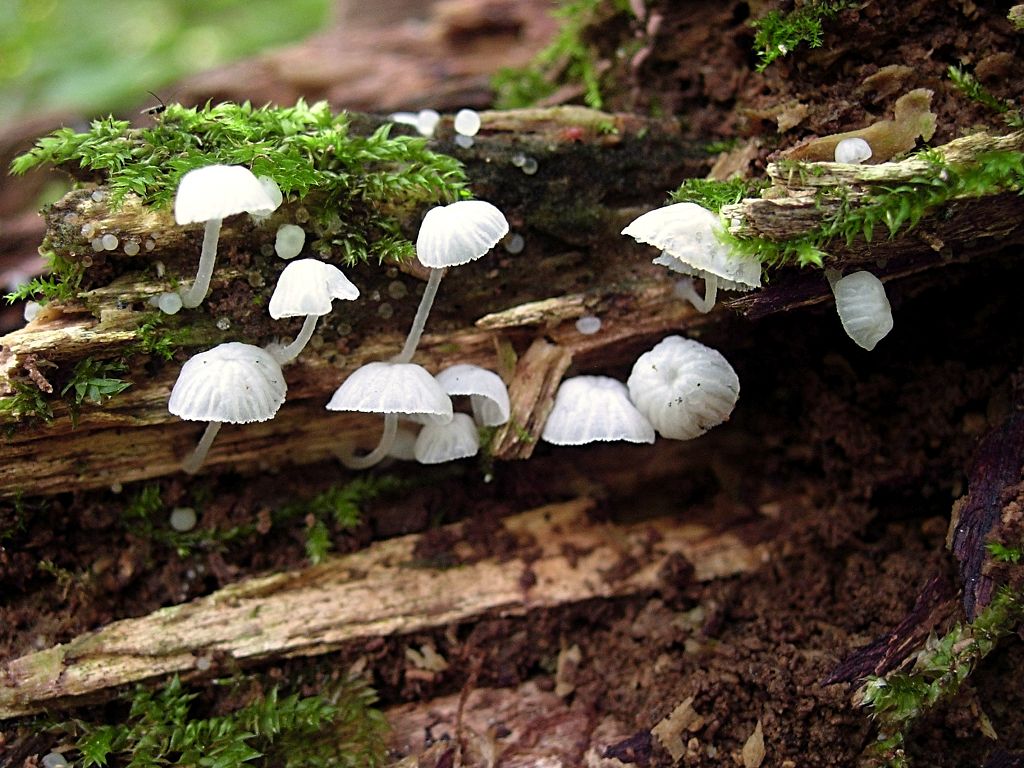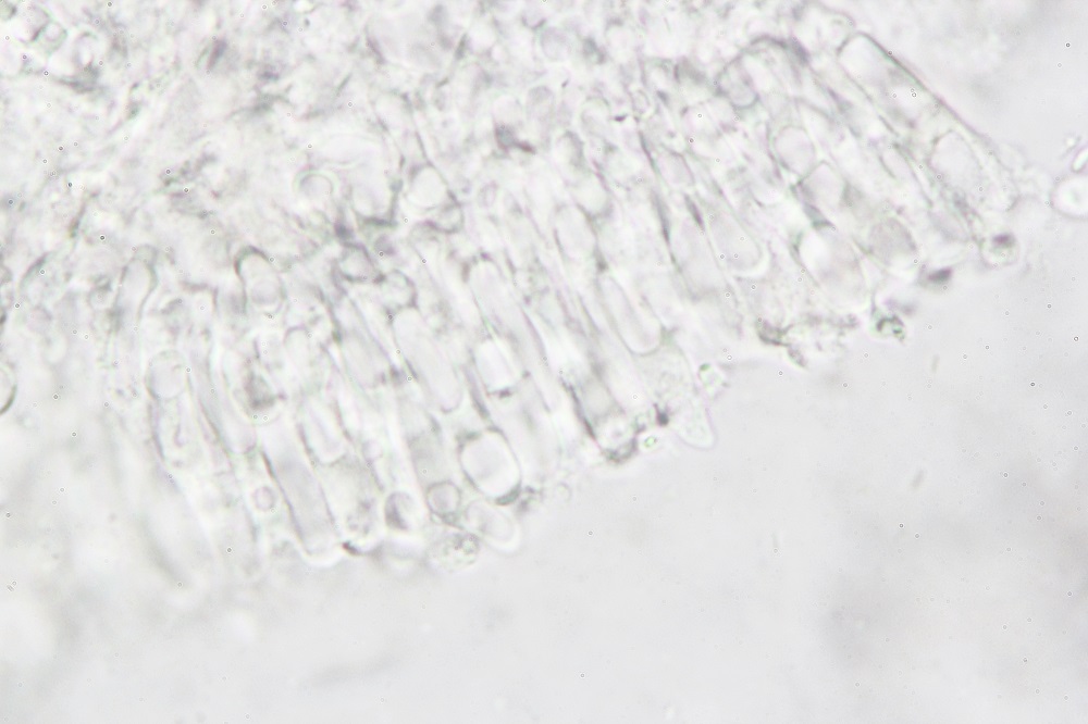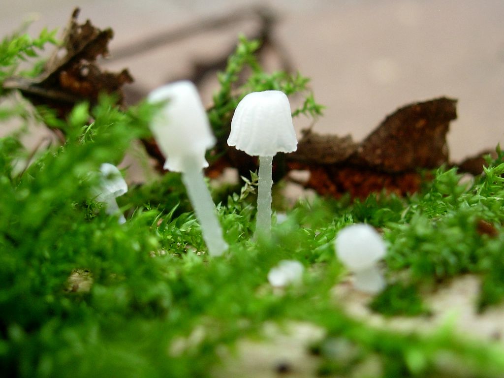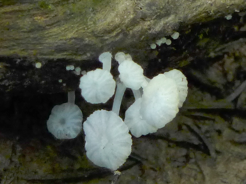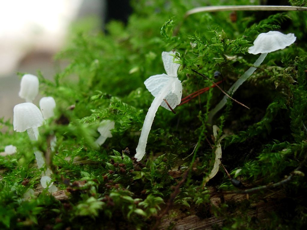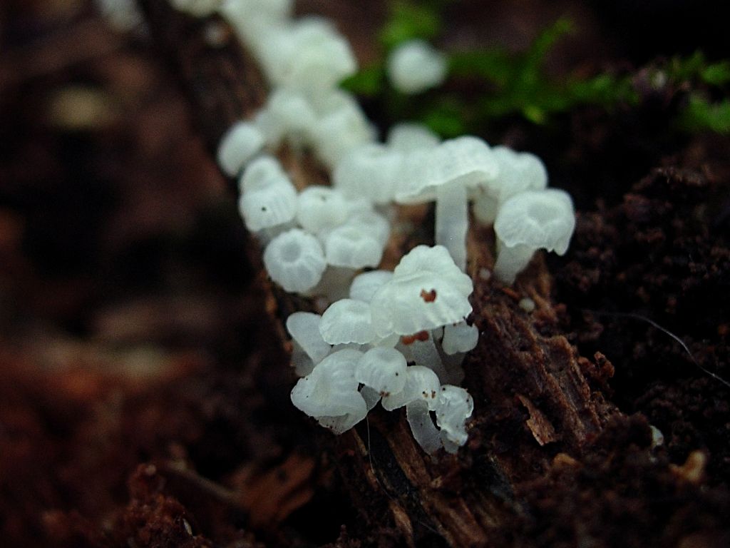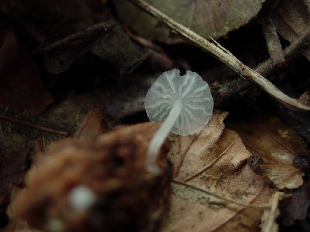 Hut: 0,5-1,5 cm, jung halbkugelig später ausgebreitet mit kleiner vertiefung in der Mitte und mit gekerbter Rand, wesslich und glatt, bei feuchtigkeit durchscheinend gerieft, sehr zerbrechlich.