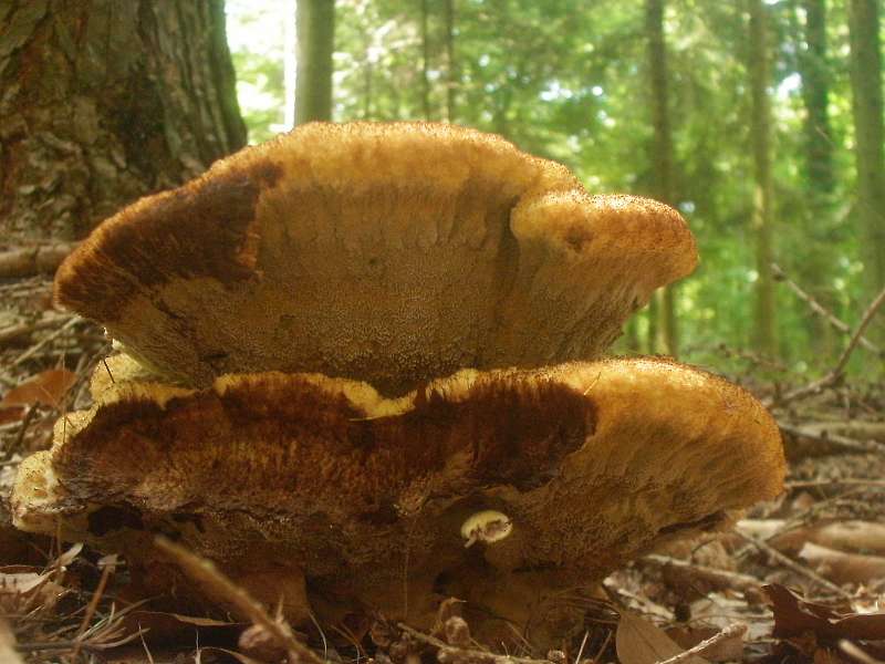 Größe des kleinen Pilze unter 10 cm breit, stämmiger strunkartiger Stiel, der größere Pilz schien aus mehreren Hüten zusammengesetzt zu sein.