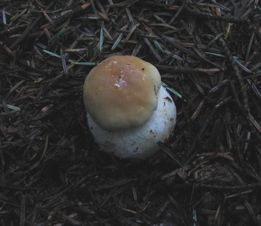 d) Kleiner junger Fichtensteinpilz (B. edulis) in dunkelstem Jungfichtenwald.