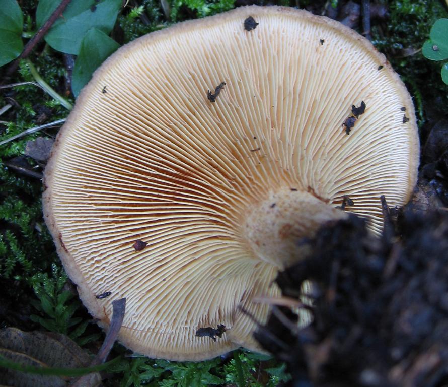 Lamellen: gelb, auf Druck dunkelbraun flechend, gegabelt, am Rand wellig runzelig, herablaufend.