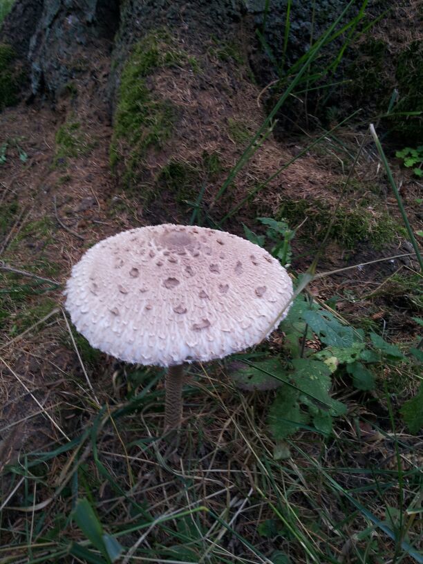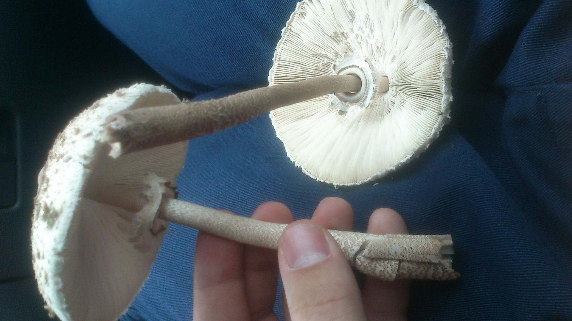 Gestern sah ich also schon 4-5 Parasole auf der Strecke und heute hat er sich dann begnadigt etwas langsamer zu fahren. Also hab ich Pilz gerufen, er legte eine Vollbremsung hin, ich sprang aus dem Auto, pflückte den Pilz und es ging weiter (Garnicht so ungefährlich in nem kurvigen Wald einfach stehen zu bleiben, wo die meisten mit 100 lang hacken :D) Okay, am Feierabend hatte ich dann zwei schöne Parasole, der Rest war zu alt.