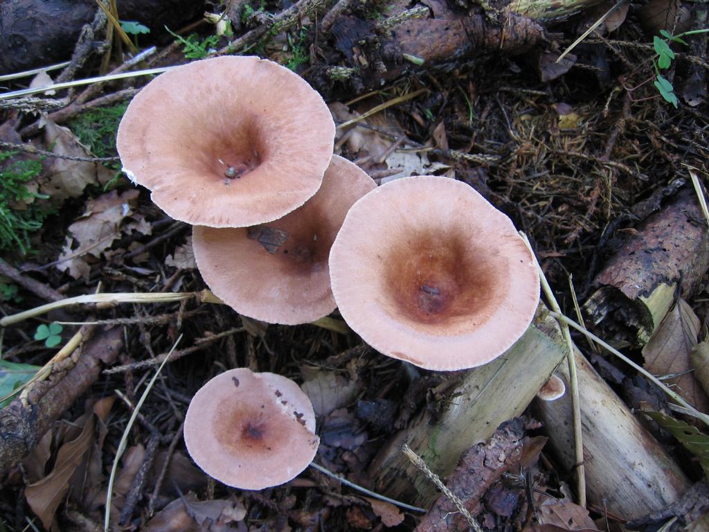 • Außerdem hat Clitocybe gibba einen weißen Stiel, und keinen orangebraunen wie die Fotopilze. Für Clitocybe costata ist mir allerdings die Hutfärbung der Fotopilze viel zu freudig rosa, C. costata hat einen trüb ockergelben bis graugelben Hut. Außerdem sind die gezeigten Hutränder regulär und nicht wirklich gekerbt. Ein Foto von C. costata habe ich beigefügt.