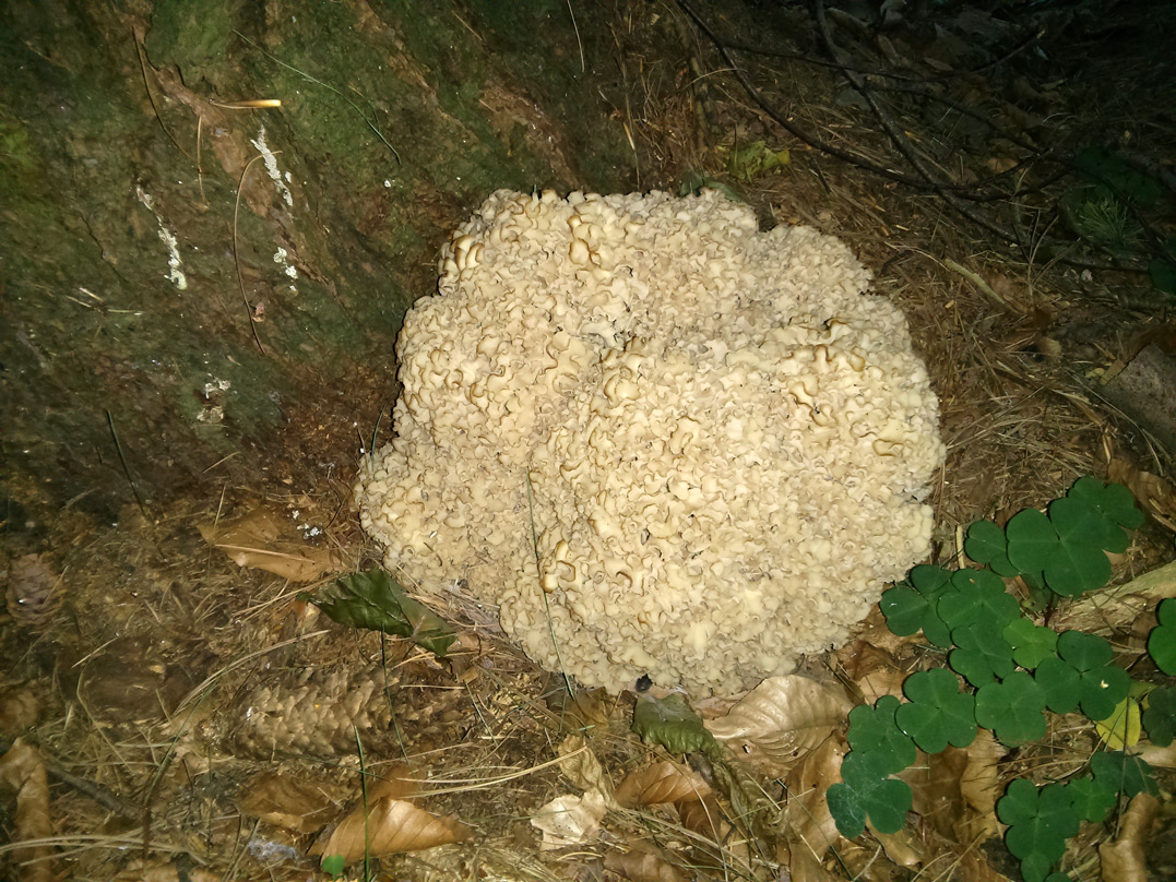 Meines Erachtens ist das eine Krause Glucke im besten Alter. Habe diesen Pilz bisher noch nie in Natura gesehen, geschweige denn gegessen. Aber da dürften eigentlich nicht viel Verwechslungsmöglichkeiten bestehen, oder? Der steht übrigens noch im Wald, da ich keinen Korb dabei hatte, denke aber, der kommt demnächst in die Pfanne...