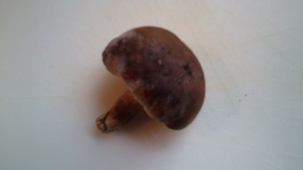 Anhand der Fotos und des verschimmelten Zustandes ist das nur schwer zu klären. Mir persönlich kommt das Pilzlein vom Habitus und Hutfarbe eher wie ein lädierter Maronen-Röhrling daher, Boletus badius. ![]()