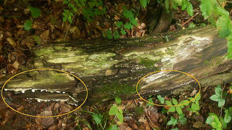 Ach ja, und das Substrat ist Eiche.... ich habe noch ein Stück Rinde entdeckt (auch nicht übermäßig eindeutig), aber es handelt sich um einen abgebrochenen Ast vom Baum nebenan, und das ist eine Eiche (mit Bruchstelle).