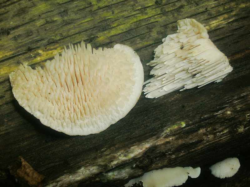 ist es Spongipellis pachyodon , der Dickstacheliger Schwammporling in jugendlicher Ausführung (aber da sollen die Sporen eher gelblich sein, sagt Aphyllopower)?