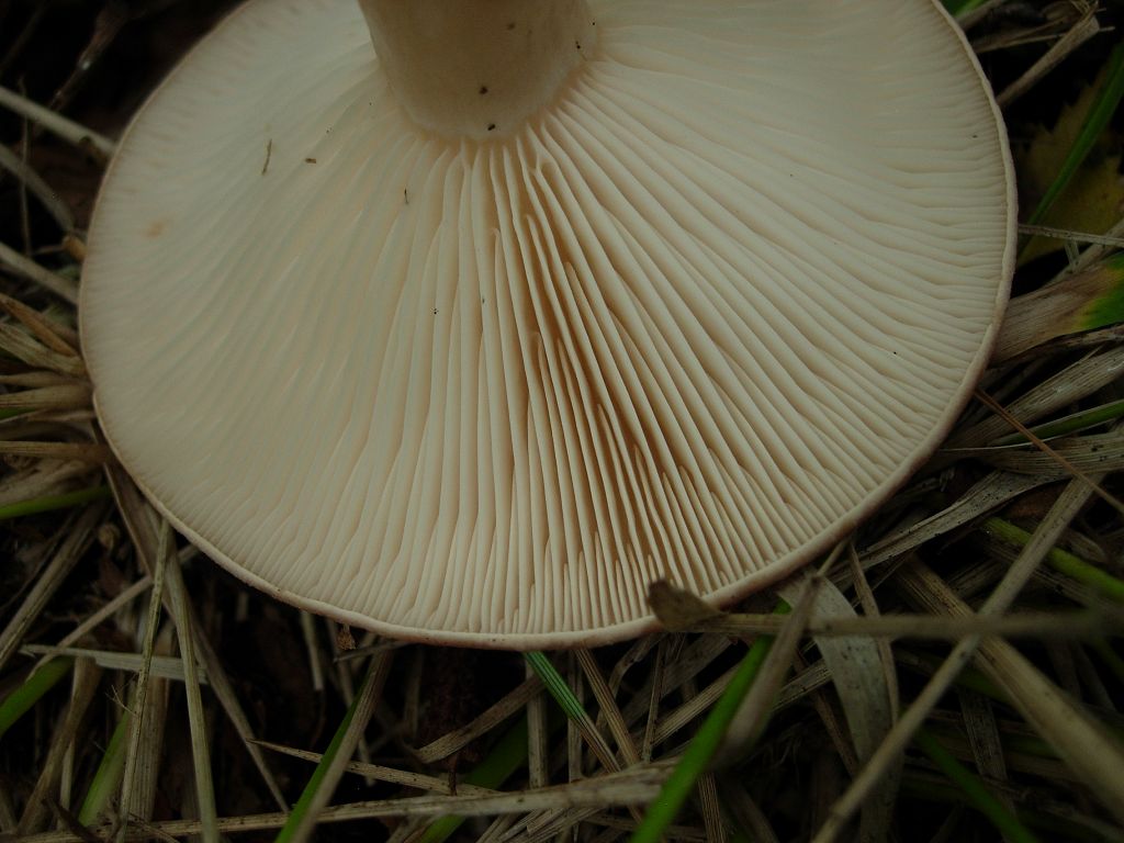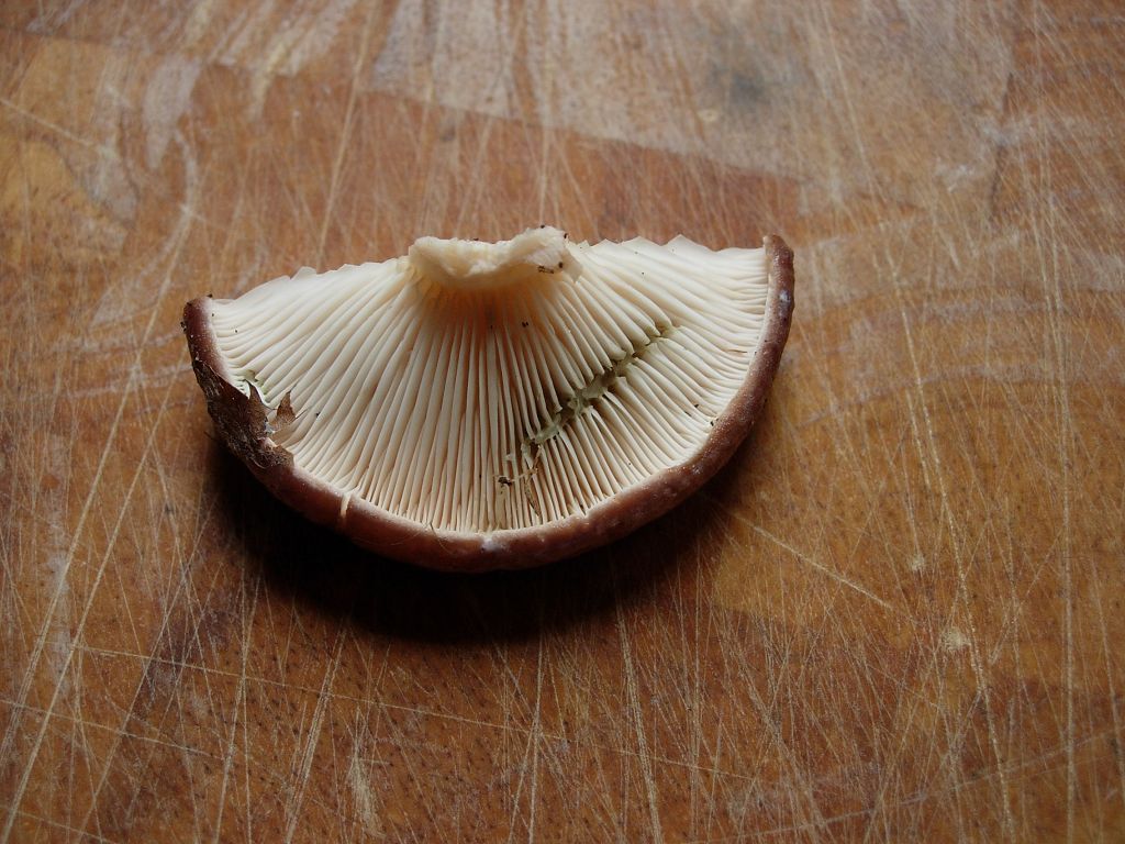 Lamellen: Angewachsen oder laufen leicht am Stiel herab, sie stehen ziemlich gedrängt und sind anfangs weißlich, och bald blass creme- bis ockergelb gefärbt. An verletzten Stellen können die Lamellen von eintrocknenden Milchtröpfchen blass blau-grünlich gefleckt sein.