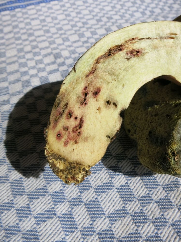 Danke für die Bestimmung, im folgenden Beitrag (http://www.pilzforum.eu/board/…highlight=Boletus+calopus) wurde ein ähnlich aussehender Schönfuss gezeigt. Vom Hut habe ich leider keine weiteren Bilder (der ist beim Fotografieren irgendwie vergessen gegangen..). Er war aber ziemlich hell, auf dem zweiten Bild sieht man das ansatzweise. Von einer Geschmacksprobe habe ich abgesehen.