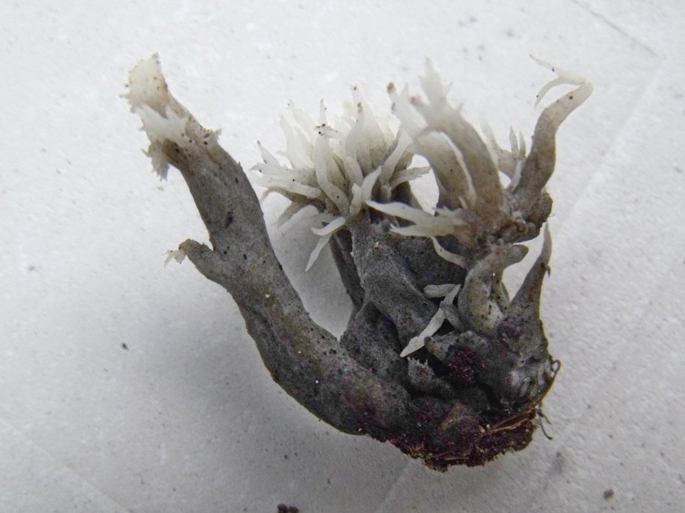 Diese kleine Koralle (2cm) habe ich am Wegesrand gefunden. Vermute Kammförmiger Keulenpilz (Clavulina coralloides). Kann das eine dunkle Variante oder doch was anderes sein. Oder ist die Koralle wirklich von einem anderen Pilz befallen (bei Wikipedia gelesen).