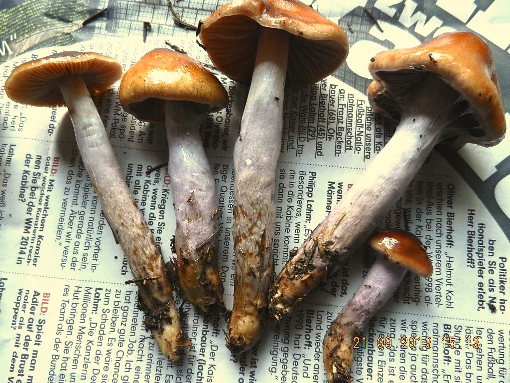 1.) Blaustiel-Schleimfuß (Cortinarius collinitus; Hut lebhaft orange- bis rotbraun, nicht nur trüb gelbbraun)