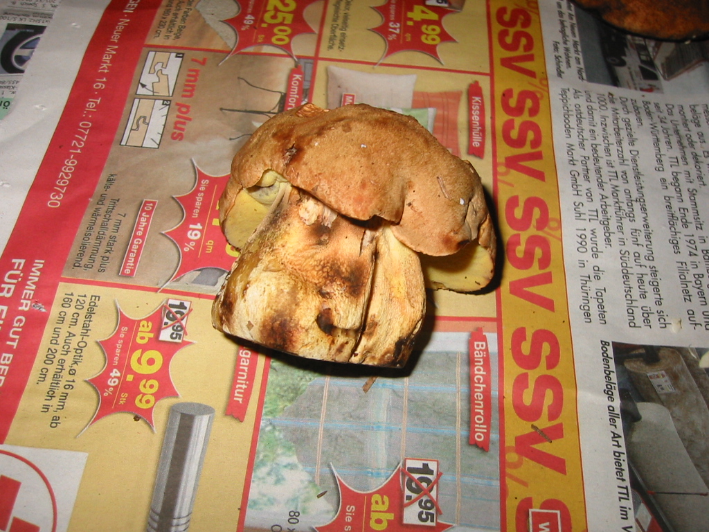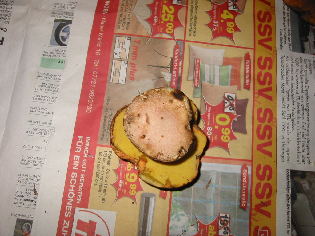 Hast du ein bischen gewartet als du den Pilz durchschnitten hast ? Der Anhängsel-Röhrling blaut +- im Schnitt oberhalb der Röhren, deswegen meine Frage. Ansonsten würde ich mich hier Meinhard und Horst anschließen mit Boletus appendiculatus. Die Nadelwaldvariante Boletus subappendiculatus ist fast identisch mit Boletus appendiculatus sie soll sich aber durch das nicht blauende Fleisch unterscheiden.