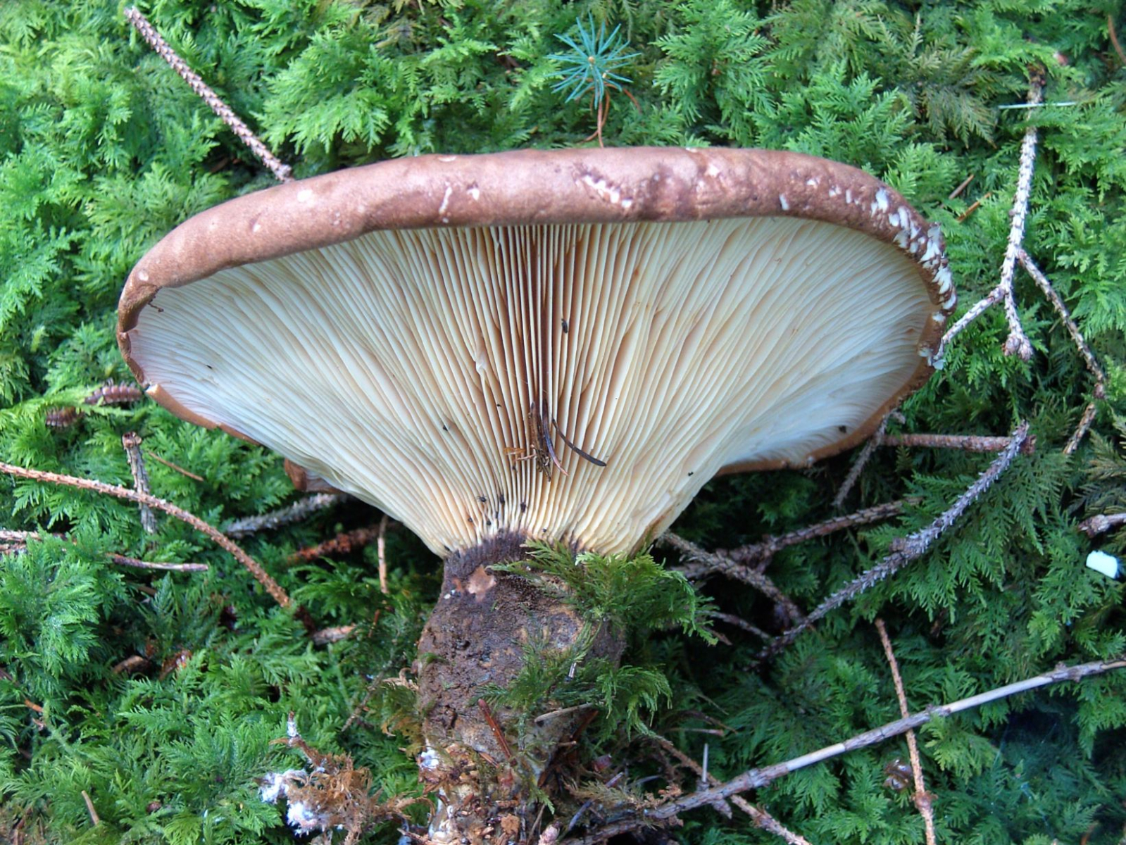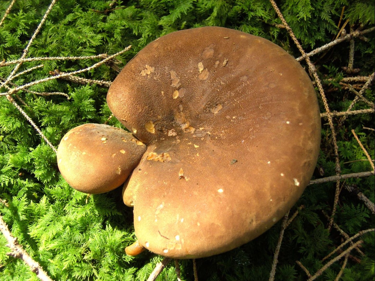 Ich denke bei deinem Fund wie Meinhard (Tapinella/Paxillus atrotomentosus = Samtfußkrempling), obwohl die Lamellen recht hell rüberkommen. Der Fichtenwald (auf dem einen Bild zu sehen) passt gut dazu, ich schätze, die Fruchtkörper sind mehr oder weniger offensichtlich an alten, morschen Fichtenstümpfen oder zumindest an Fichtenholz gewachsen.