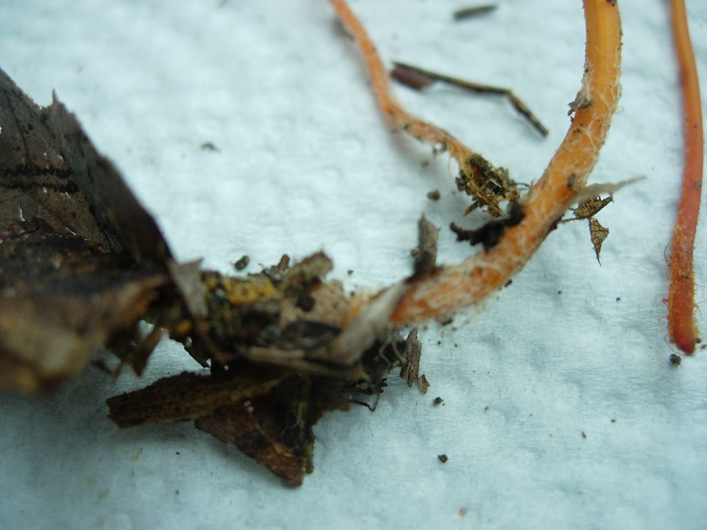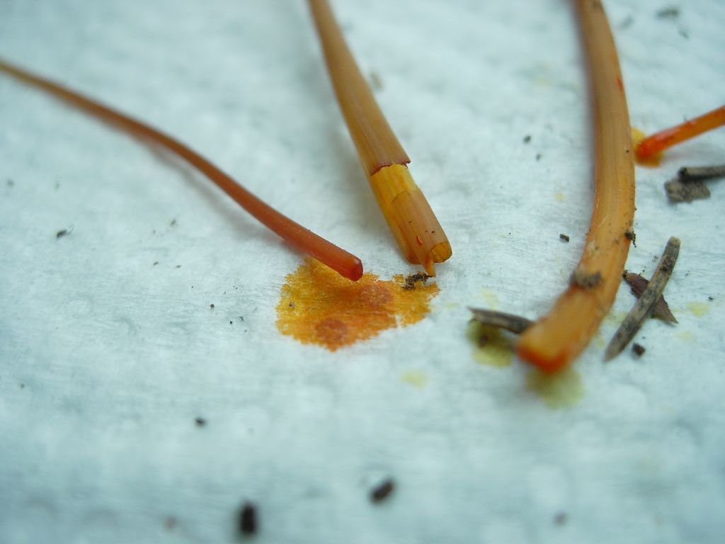 Stiel: 8-12 cm lang und dünn, jung fast blutrot oder rötlich-gelblich, bald rotbraun, Basis vom Myzel striegelig, bei verletzung scheidet er ein safranfarbener Milch Tropfen.