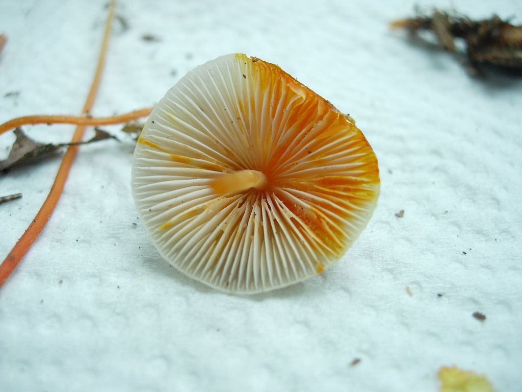 Lamellen: weißlich, ausgebuchtet und am Stiel angewachsen, bald mit safranfarbenen Flecken.