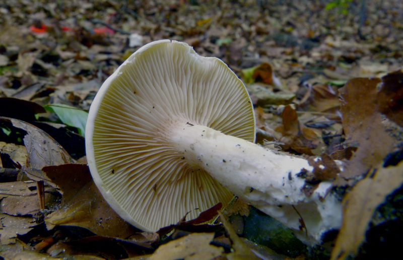 Und wegen der eher herablaufenden Lamellen und der Wuchsform würde ich das auch viel eher für einen Mehlräsling (der durchaus recht stämmig sein kann), oder eben einen der sehr ähnlichen, weißlichen Trichterlinge.