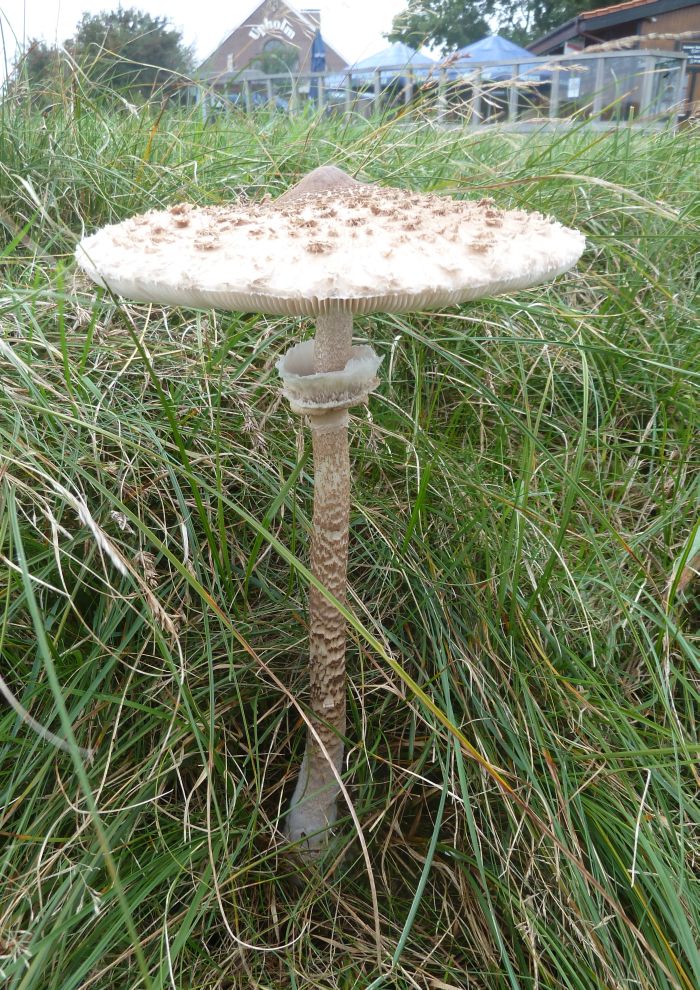Dann bemerkte ich auf der anderen Seite des Deiches auf einer Pferdeweide–¦ richtig. Und bis ich bei den dreien da angelangt war (dazu musste ich an der Seite einen Zaun entlang) war mein Parasol-Zähler bei sage und schreibe vierzehn Exemplaren von zehn Zentimeter Durchmesser bis zu diesem Riesen da mit etwa zweiundzwanzig Zentimetern.
