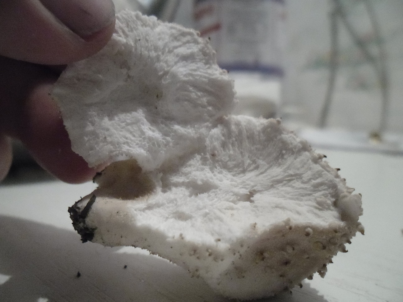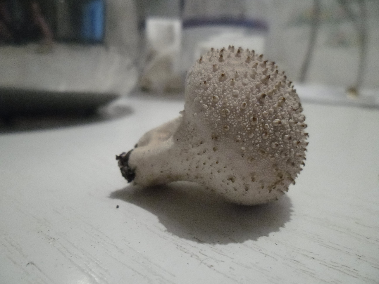 Gefunden auf einer Lichtung im Fichtenwald. Pilz ist unten eher weiß und oben cappuccinofarben. Er ist mit leicht abreibbaren Pyramiden besetzt. Die Größeren haben schwarze Spitzen. Das Fleisch ist weiß und erinnert an Marshmallows. Unauffällig im Geruch.