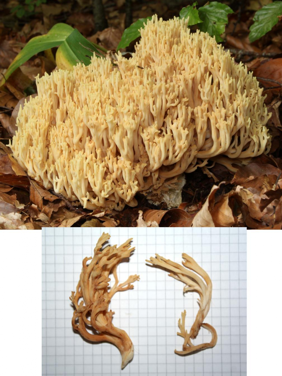Fruchtkörper: Relativ groß (ca. 15 cm), Stiel weiß, Äste leicht gerieft, außen gelb-hellgelb, innen weiß, spröde und leicht brüchig