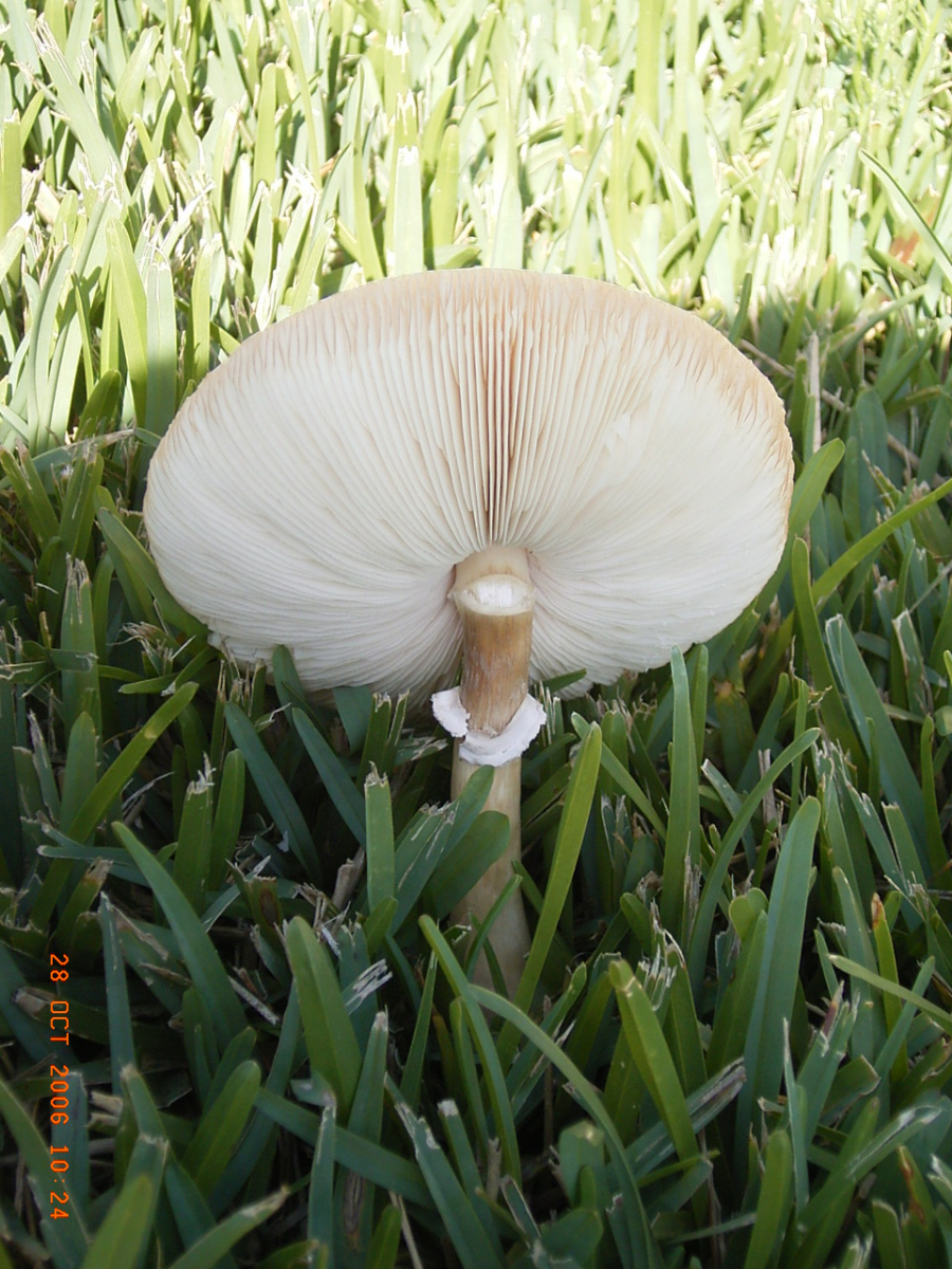 jetzt mal spass beiseite, der pilz hat aber keine knolle unten dran. die lamellen sind leicht rosa, der stiel gerade und relativ duenn, der hut aehnlich einem champinion, weiss bis leicht braeunlich...