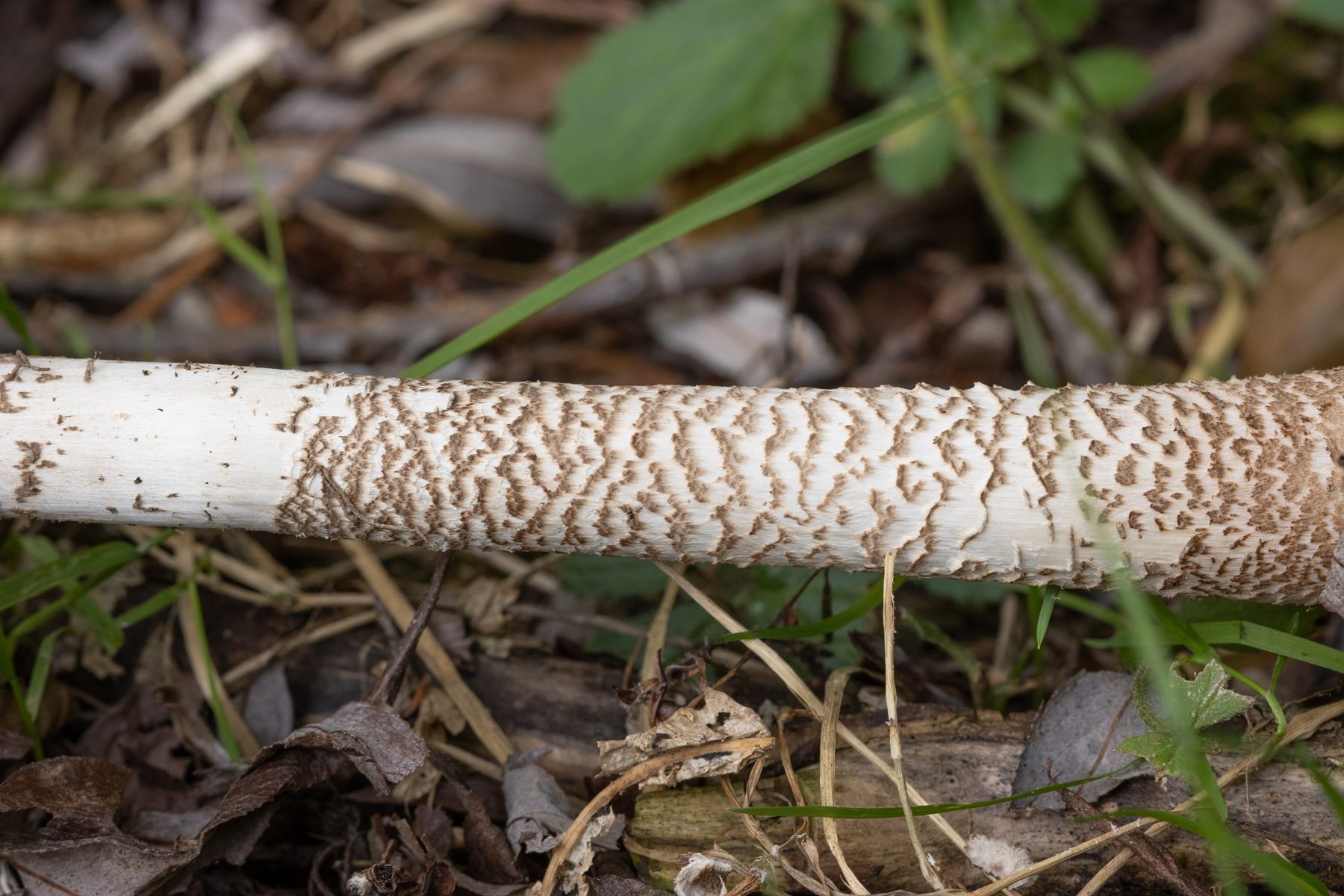 Bild 2: Der Stiel ist auf der gesamten Länge auf hellem Grund dunkelbraun genattert, die Stielbasis ist eher knollig und verdickt.