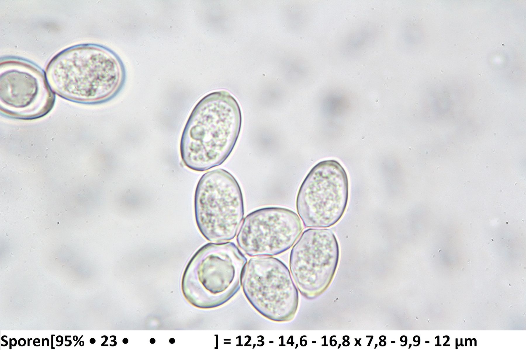 Die Sporen messen 12–“18 × 9–“11(12) µm. Sie sind ellipsoid geformt und sehr dickwandig. Sie weisen einen kleinen Keimporus und eine hyaline Kappe auf. Die Lamellenschneiden sind steril.