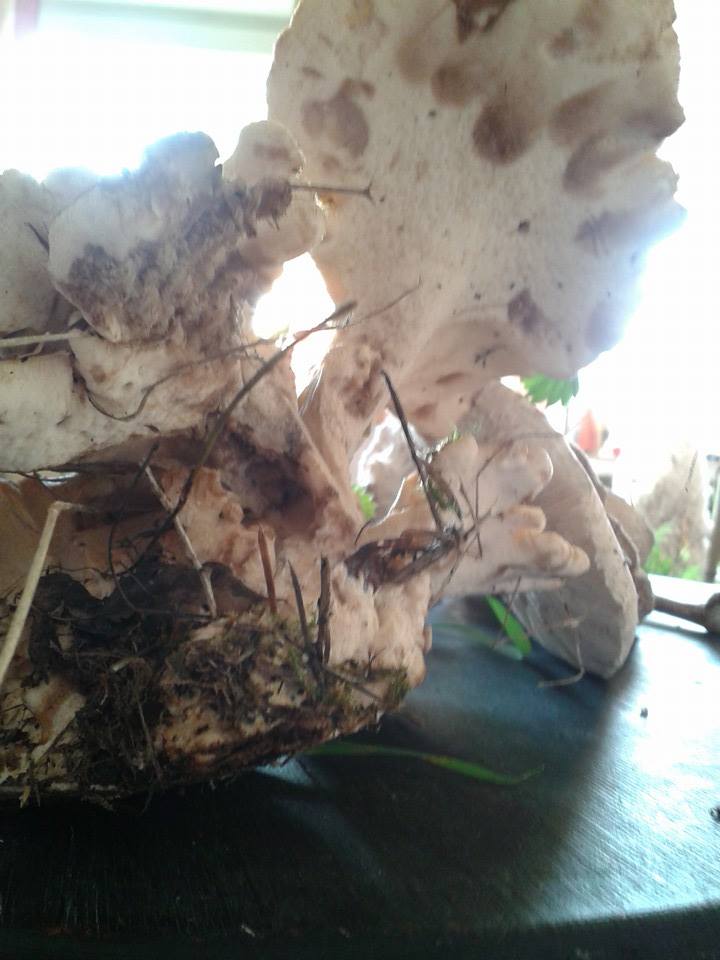 Er ist gelblich/bräunlich und sein Schirm (oder sind es mehrere Schirme?) ist 25cm etwa im Durchmesser. Unten ist er eher schwammig, kleine Kapillaren die von unten Richtung Schirmoberseite leicht schräg verlaufen, keine Lamellen.